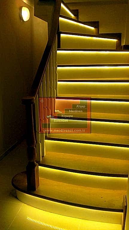 Led aydınlatmanın oldukça şık görünebileceği modellerden biri ahşap basamak ile paslanmaz korkuluk ve küpeştenin bir araya geldiği modern merdivenlerdir. Mimari proje merdivenin korkuluklu olarak değil de iki duvar arasında yapılmasını gerektiriyorsa, led aydınlatmalardan bu durumda da yararlanılmaktadır. Zira korkuluk ve küpeşte, merdivenin görünümüne estetik katan unsurlardır ve bunlardan birinin yokluğunda azalacak olan etkiyi led aydınlatma ile telafi etmek mümkündür.
